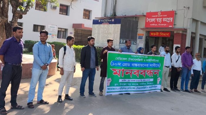পার্বতীপুরে সম্মিলিত মেডিকেল টেকনোলজিস্ট ও ফার্মাসিস্টদের ১০ম গ্রেড বাস্তবায়নের দাবিতে মানববন্ধন