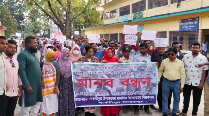 প্রথমিক শিক্ষকদের উপর পুলিশি হামলার প্রতিবাদে পার্বতীপুরে বিক্ষোভ, মানব বন্ধন ও সমাবেশ