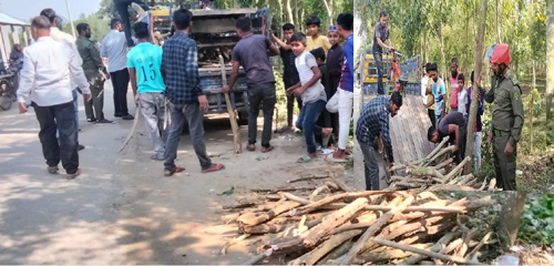পাবর্তীপুরে বনবিভাগের গাছ কাটলেন আওয়ামী নেতা গাছ সহ ভ্যান আটক